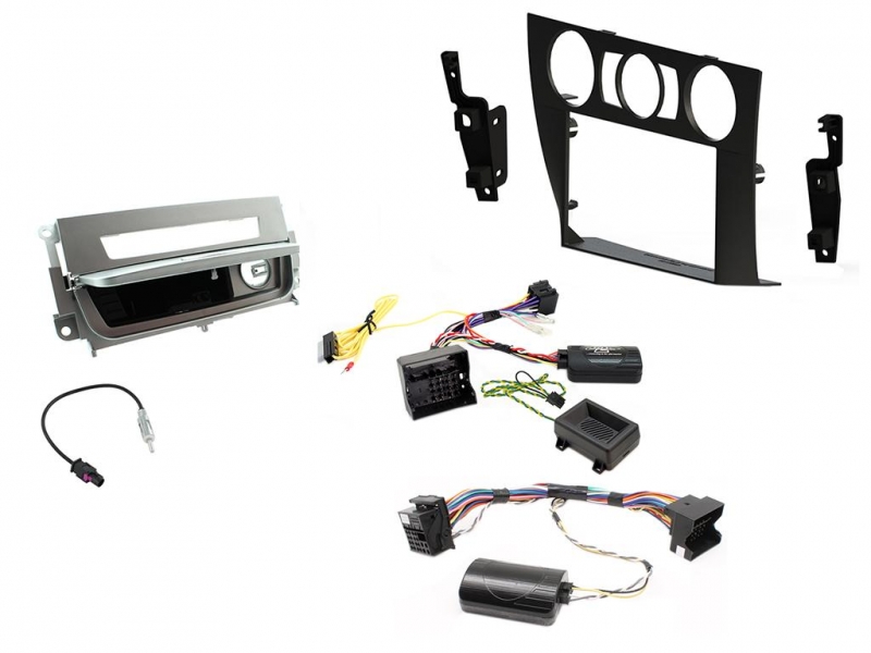 Ett installationskit som passar i BMW 3-Serie (E90) 06-14. Det är en komplett monteringslösning med en dubbel-din monteringsram, silverfärgad ifyllningskit för askkopp, CAN-Bus rattstyrningskontroll och parkeringssensorgränssnitt, samt Fakra antennadapter.