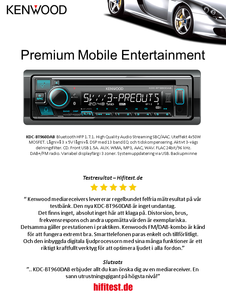 "Kenwoods mediareceivers levererar regelbundet felfria mätresultat på vår testbänk. Den nya KDC-BT960DAB är inget undantag. Det finns inget, absolut inget här att klaga på. Distorsion, brus, frekvensrespons och andra uppmätta värden är exemplariska. Detsamma gäller prestationen i praktiken. Kenwoods FM/DAB-kombo är känd för att fungera extremt bra. Smarttelefonen pasar enkelt och tillförligt. Och den inbyggda digitala ljudprocessorn med sina mina funktioner är ett riktigt kraftfullt verktyg för att optimera ljudet i alla fordon." - hifitest.de