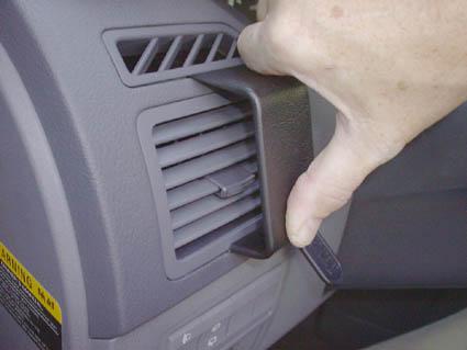 En hand justerar luftutloppet i en Kia Carens 03-06.