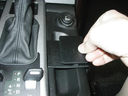 Konsol och växelspak med hand som håller en platta i en Landrover Range Rover.