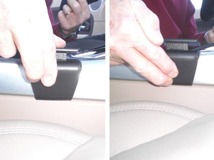 Bild visar en hand som justerar en konsoldetalj i en bil.
