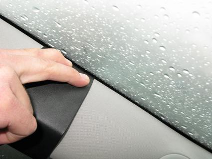 En hand trycker på ett material vid en bilruta med regndroppar.