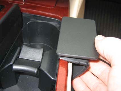 En hand håller ett avtagbart lock över en förvaringsplats i en bilkonsol.
