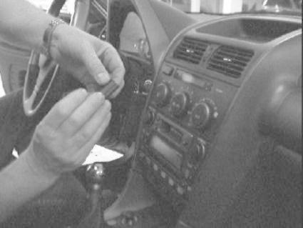 En hand arbetar med en verktyg på bilens instrumentpanel.