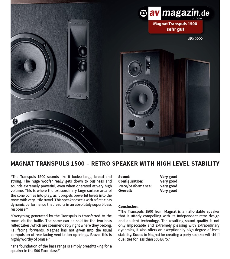 Magnat Transpuls 1500 är en Kraftfull och spelglad golvhögtalare med retrofinish a la 1950-tal. I basområdet spelar ett 15" element, som tillsammans med sina kombattanter, sätter rummet i gungning och grannarna i skräck. Detta är en svårslagen kombination av både diskoljud och en grym Hifi-högtalare. Många av marknadens liknande konstruktioner spelar enbart högt, om de inte kostar 4-5 gånger pengarna. Dessa pjäser rekommenderas starkt!