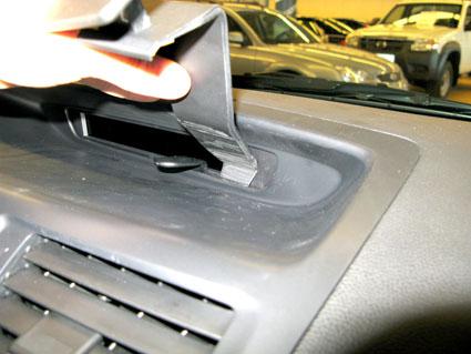 En hand placerar en del i instrumentpanelen på en Mazda 5 11-15.