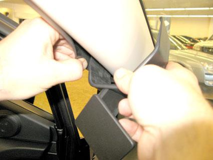 En person tar bort en klämma från bilens takbeklädnad.