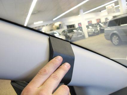 En hand pekar på en del av en bils inredning vid vindrutan.