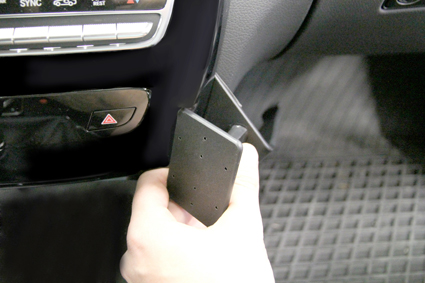 En hand som installerar ett vinklat svart tillbehör i bilen.