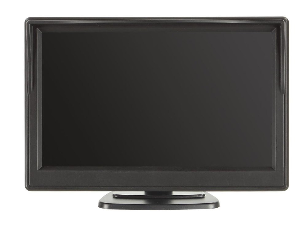 Monitorn är tillverkad i plast och har en svart/anthracite färg. Den kommer med en fot som har ett patentfäste för skruv- och liminstallation samt en vindrutesugkoppsfäste för flexibel montering. Inställningar kan göras på baksidan av skärmen, vilket gör det enkelt att justera efter behov. Monitorens strömförsörjning kräver en ACV-systemkontakt med lösa kablar; röd kabel för +12V tändning och svart kabel för GND.