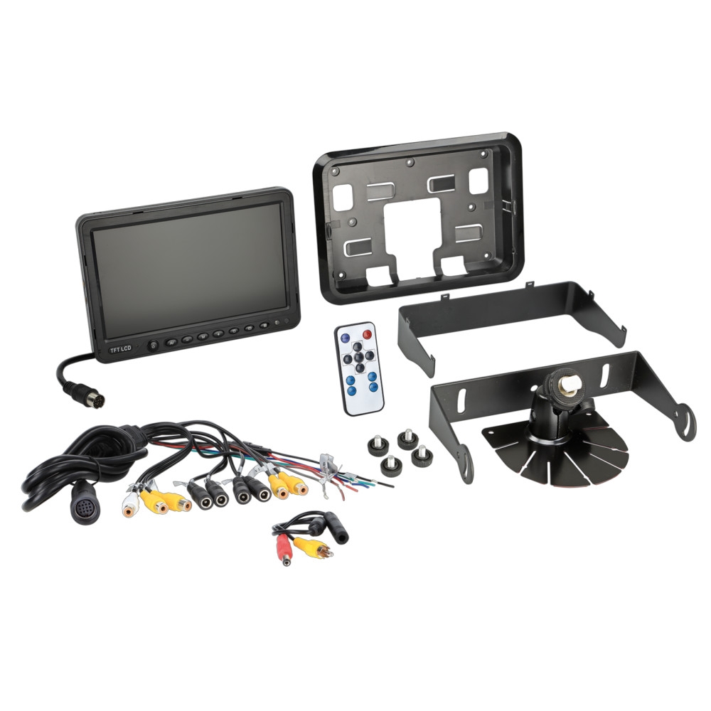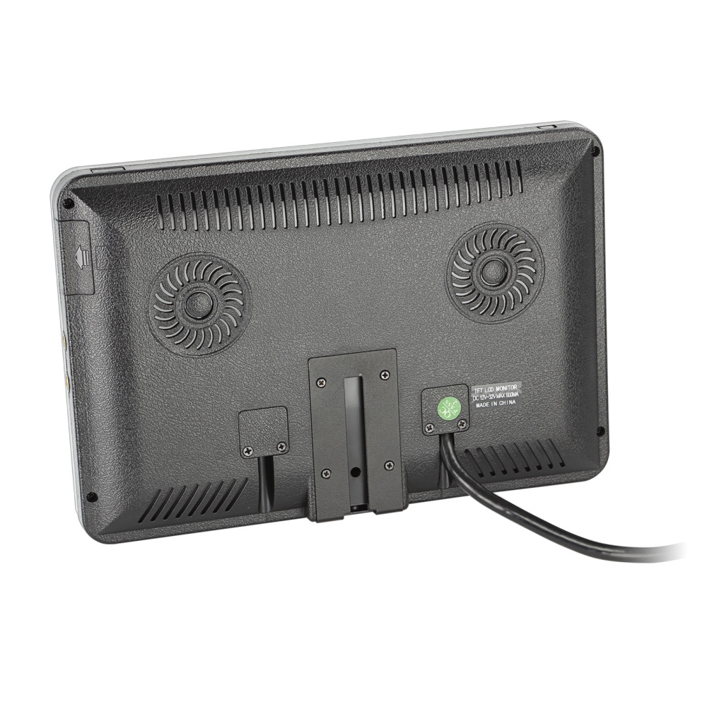 Monitorn är designad i plast med en stabil fot och metallfäste, vilket gör den lätt att installera i olika fordon. Den levereras med en adapter för montering på nackstödet, vilket ger flexibilitet i installationsalternativen. Dessutom har monitorn en automatisk strömslag med signalingång via triggerfunktion, vilket gör att den slås på när en kamera aktiveras. Medföljande fjärrkontroll gör det enkelt att styra inställningarna på avstånd.