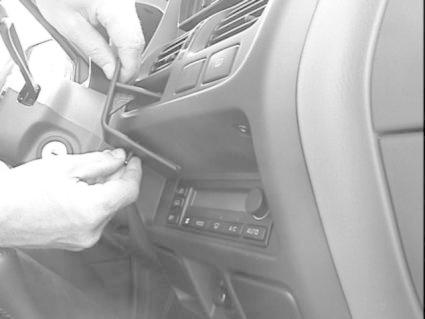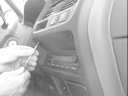 En hand håller i en skruvmejsel nära bilens stereoenhet.