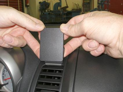 Två händer håller i en svart plastdel som ska monteras på en bils instrumentbräda.