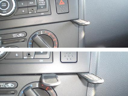Bilden visar en bilinteriör med en hand som håller i en panel vid kontrollpanelen.