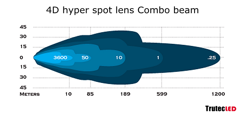 IP68 vattentät, färgtemp 6000K, livslängd på minst 50000h och backventil för att förhindra att kondens av fukt samlas i lampan. 4D projektor lins, med en ljusbild som kallas Combo. Combo innebär att de åtta yttre dioderna i varje ände har en 30 graders 4D lins för bredare ljus, medan resterande 24st dioder har 10 graders 4D lins för att lysa så långt som bara möjligt. Combo-ljusbilden är helt rätt som komplement till bilens helljus. Hur ljusbilden ser ut kan man se på bilden ovan, så ser man att får både längd och bredd på ljuset.
