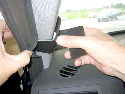 En hand fäster en del vid bilens vänstra högra sätesstolpe.