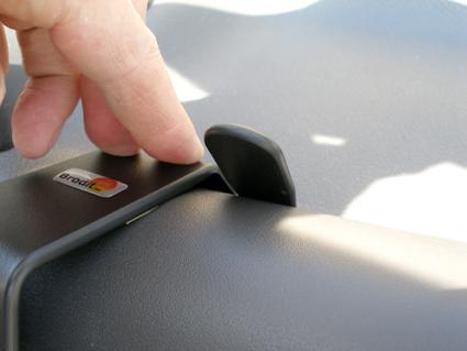 En hand trycker på en panel eller knapp i en Opel Corsa.