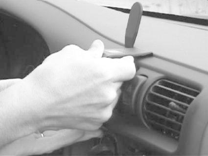 En hand installerar en enhet på instrumentbrädan i en Opel Frontera.