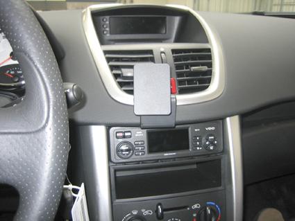 En hållare för att fästa mobiltelefon i en Peugeot 207.