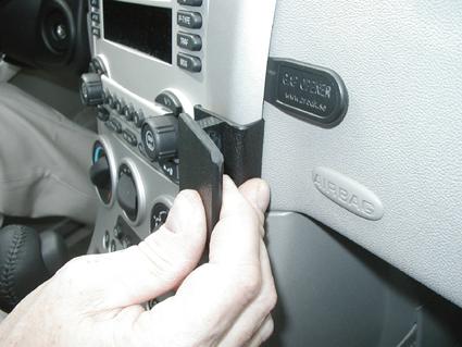 En hand som pekar mot en monteringsbygel på en bilradio.
