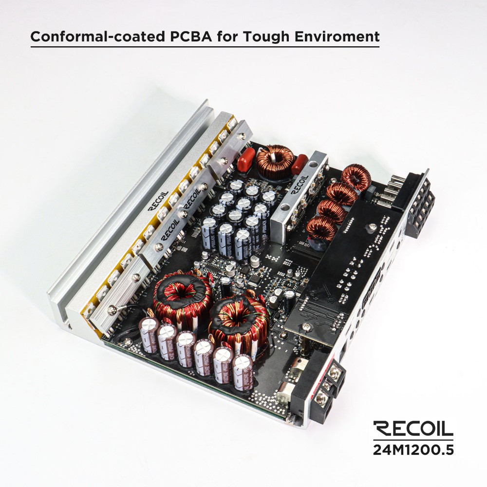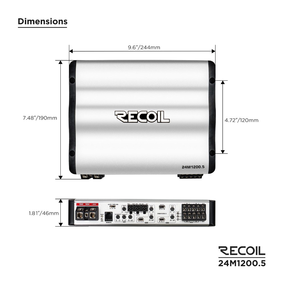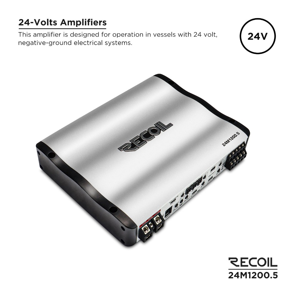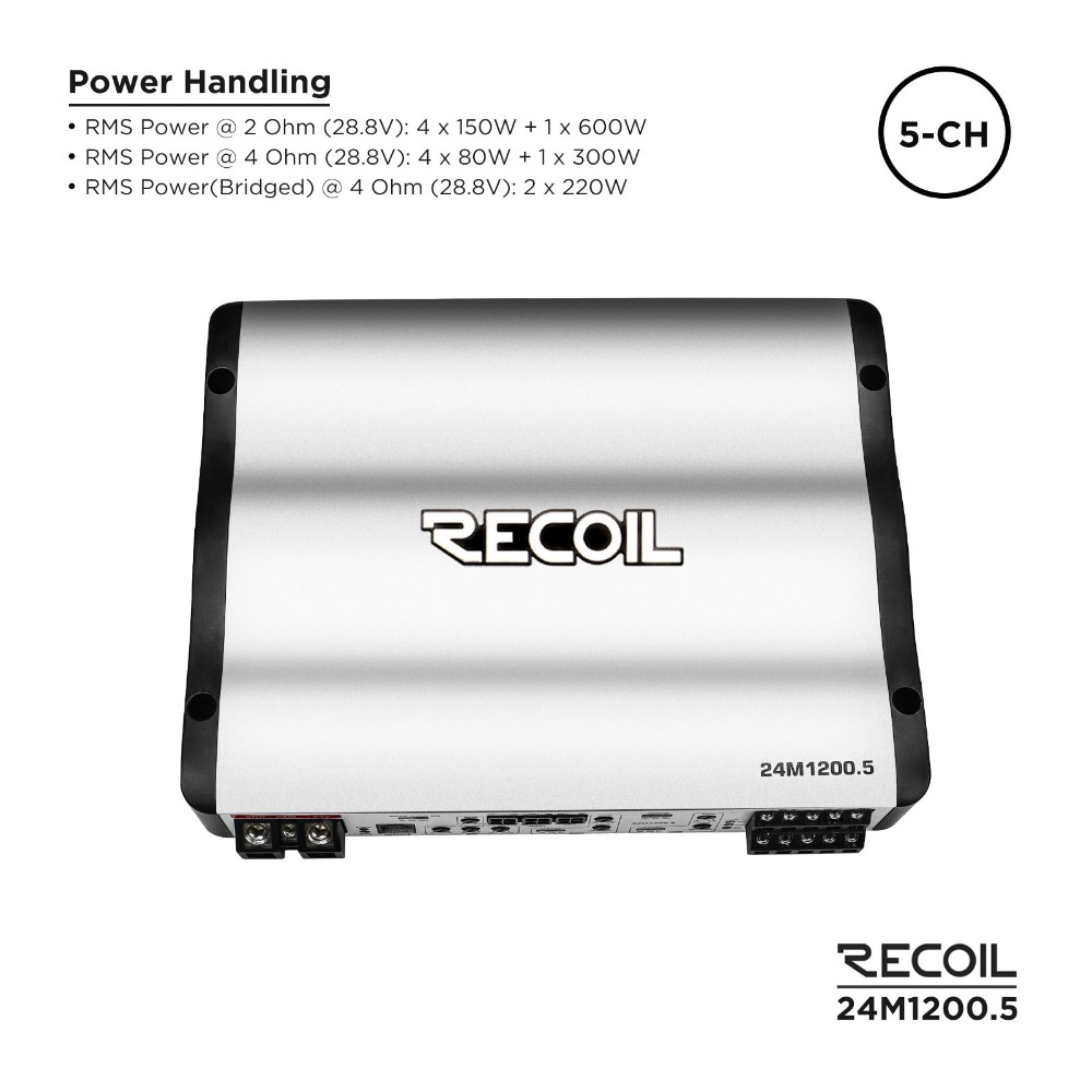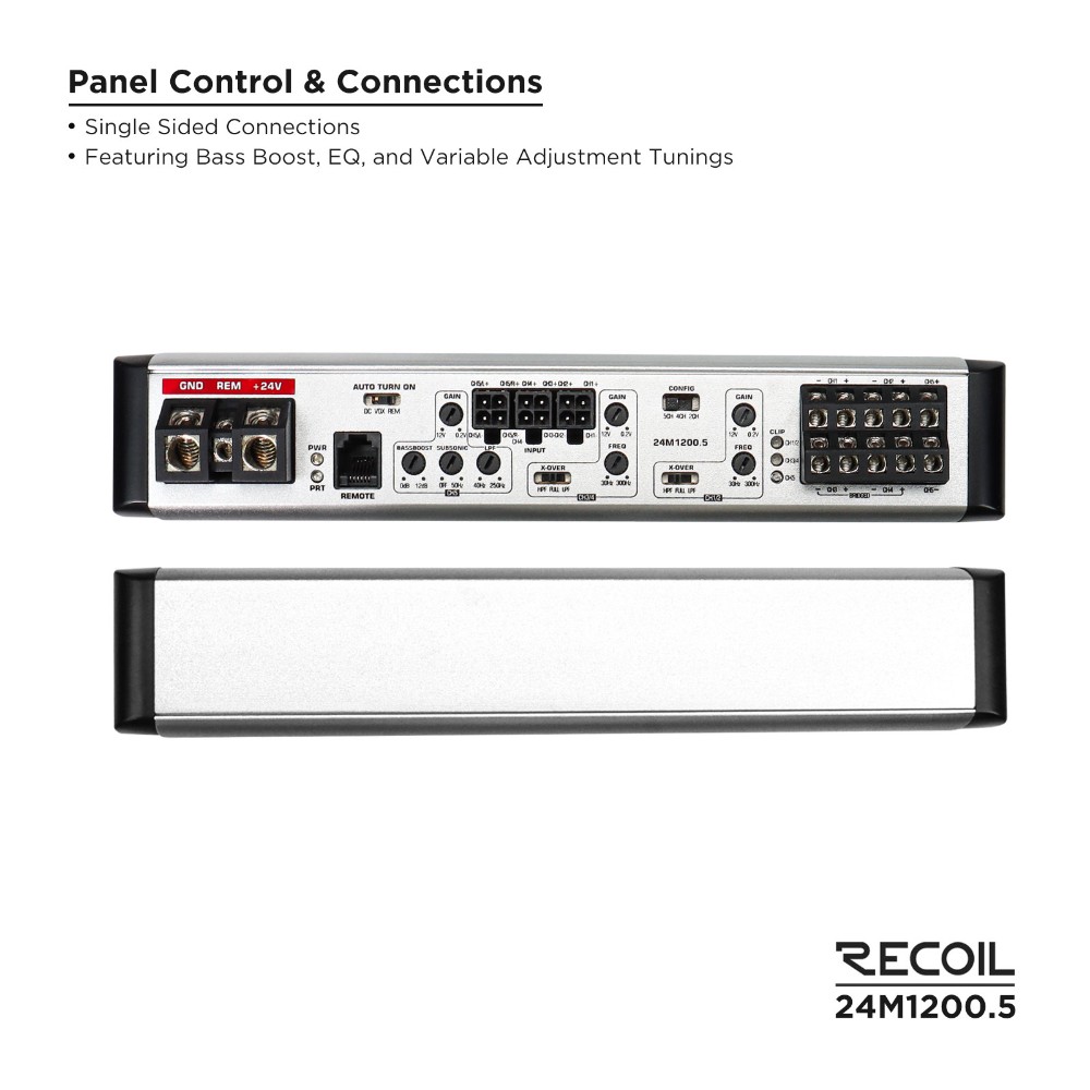 Recoil 24M1200.5 är ett klass D 5-kanals slutsteg byggt för 24V-system, alltså perfekt för lastbil. Du får fyra kanaler till högtalarna och en separat monokanal till bas, allt i ett och samma steg. Resultatet är ett riktigt smidigt bygge där du slipper flera slutsteg, men ändå kan få ordning på både tryck och kontroll i hela ljudsystemet.