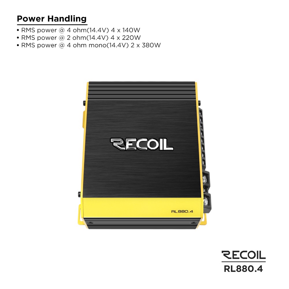 Recoil RL880.4 är ett klass D 4-kanals slutsteg i L-3-serien för dig som vill ha ett tydligt lyft i hela systemet. Mer kraft till dörrarna, mer kontroll när du spelar på, och ett format som fortfarande är lätt att få in i bilen. Kör 4 kanaler rakt av, eller brygga och lägga mer effekt där du vill att det ska hända mer.