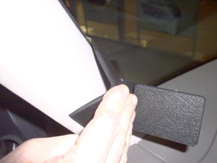 En svart plastdel monterad på bilens inre panel vid vindrutan.