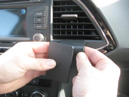 En hand håller en svart del som ska fästa vid luftutloppet i en bil.