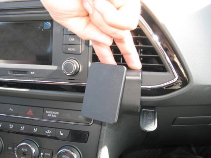 En hand håller en vinklad enhet som fästs på instrumentpanelen.