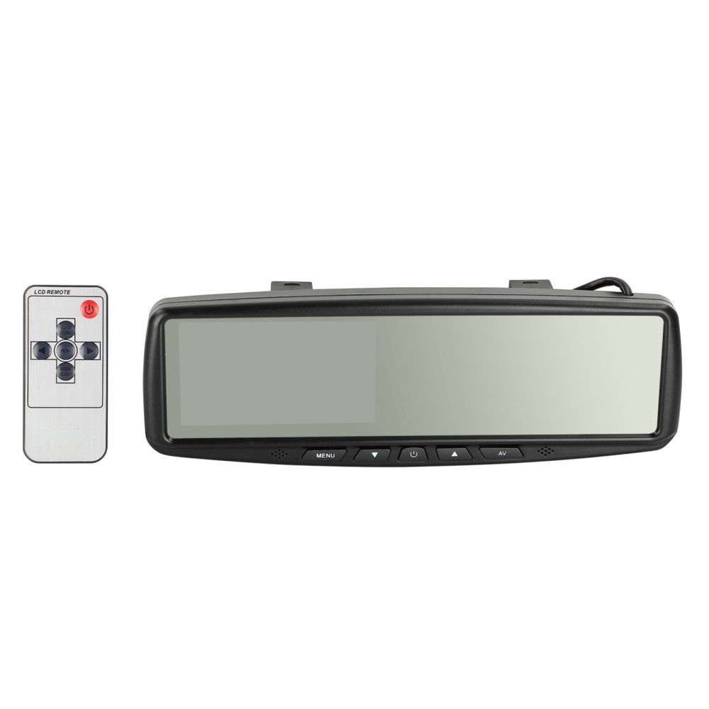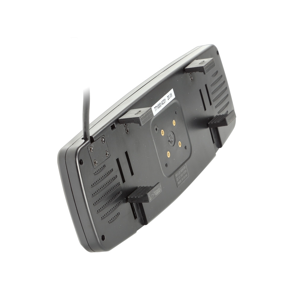 Monitorn har en universell hållare som gör det möjligt att montera den på OEM-spegeln i bilen. Anslutningen sker enkelt med hjälp av en röd kabel som kopplas till en växellast på +12V till +24V, en svart kabel för jord, och en grön kabel för att trigga videosignalen.