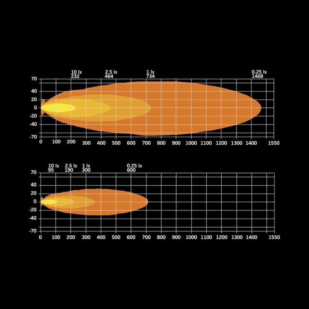 - Utökad räckvidd och bredare ljuskägla: Se längre och få ett dramatiskt bredare synfält – över fyra gånger bredare än bilens vanliga helljus – vilket gör att du kan förutse potentiella faror och reagera mer effektivt. Denna lösning har ett faktiskt ljusflöde på 4979 lumen och belyser 418m (vid 1 LUX), vilket ger exceptionell sikt.