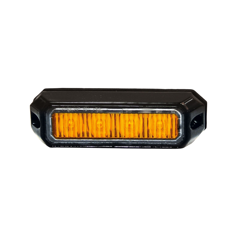 Stilrent orange varningsblixtljus med svart ram. Innehåller 4 dioder och 18 blixtmönster.Produktblad