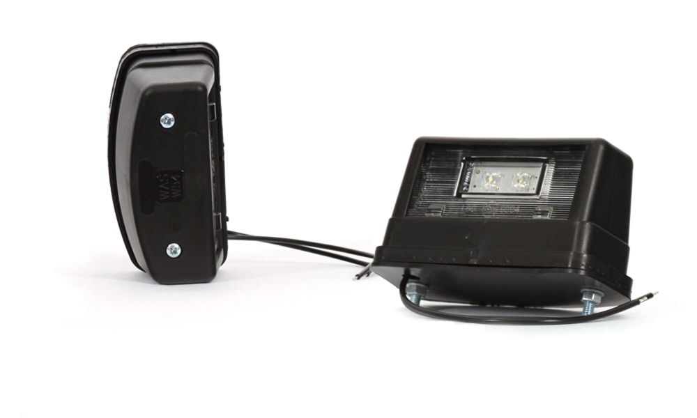LED nummerplåtsbelysning med svart yta och klart glas nedtill. Rektangulär, robust form och 2 dioder.Produktblad