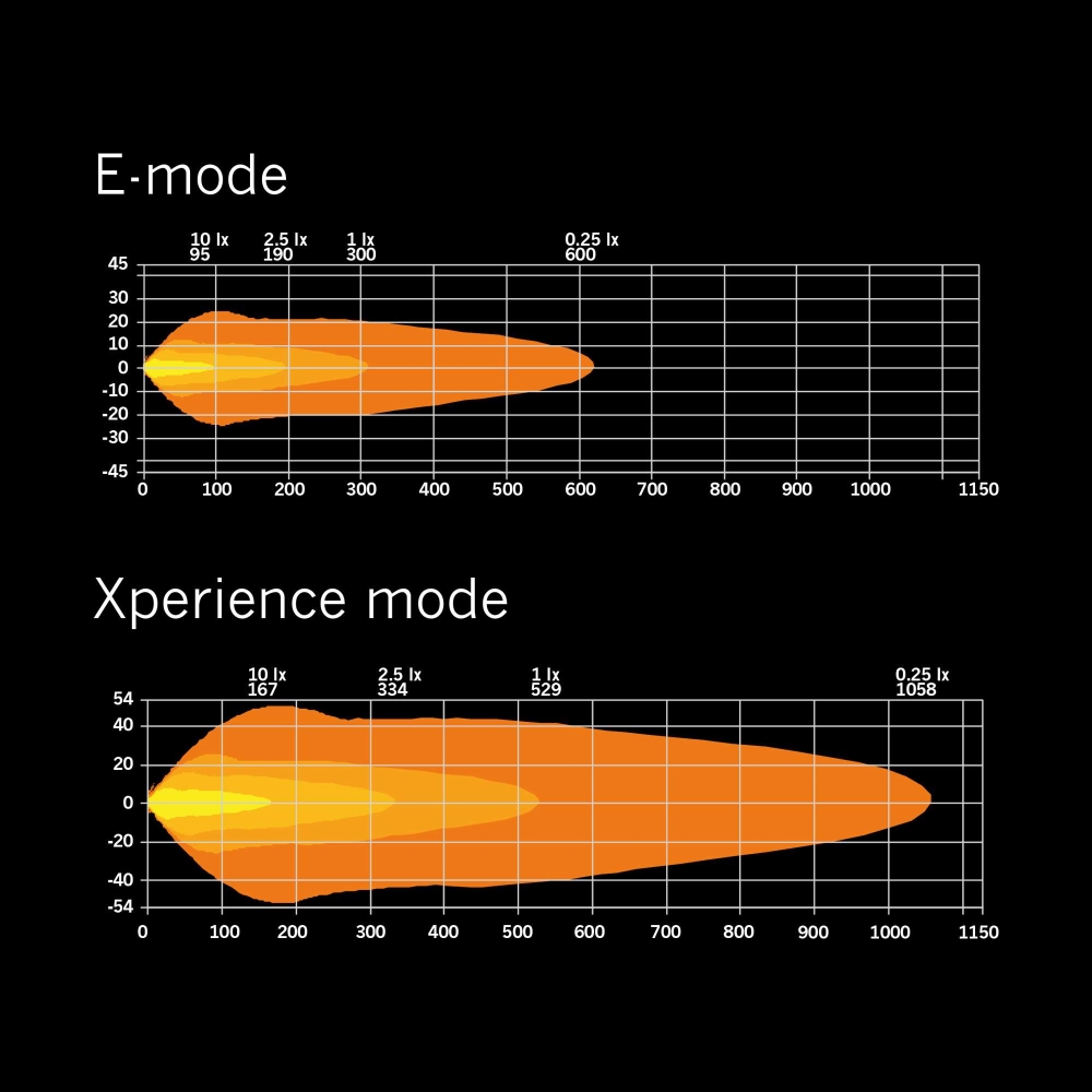 Längd: 1 lux: E-mode: 300m / Xperience mode: 529m