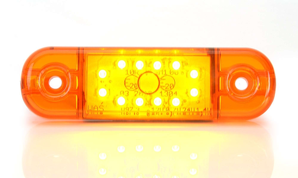 Slim LED sidomarkering med 12 dioder och orange glas, enkel installation och användarvänlig design.
