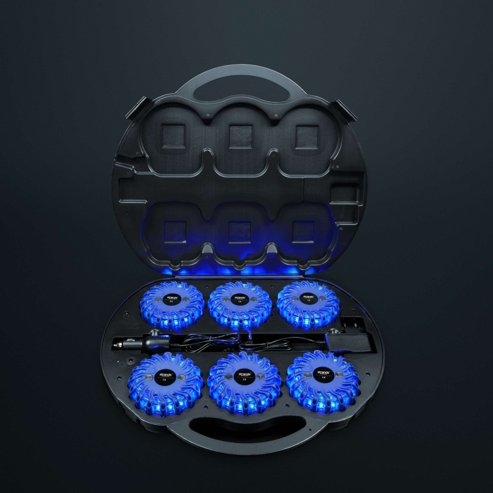 Väska med 6 stycken blå, uppladdningsbara varningspuckljuspuckar. Strands Lighting Division's blå varningsljuspuckar med uppladdningsbara batterier gör dig synlig på långa avstånd. Den ringa storleken gör produkten enkel att förvara i fordonet. Vattentät och flytbar med 16 långlivade LED's. Stark magnetisk bas för montering. Perfekt för användning inom trafiken för att varna andra trafikanter. Kan uppmärksamma faror vilket gör detta till ett mycket flexibelt verktyg. Kommer med 12/24V och 240V laddare.