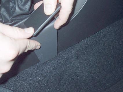Händer som installerar en konsol i en Subaru Outback 04-06.
