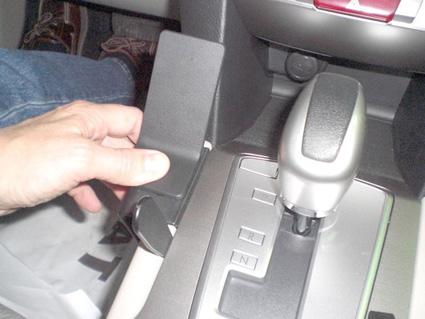 Konsol med gapöppnare för Subaru Outback 10-14, vy från bilens interiör.