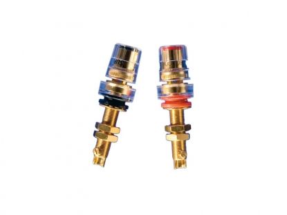 Högtalaranslutningar i röd och svart med guldpläterade kontakter.