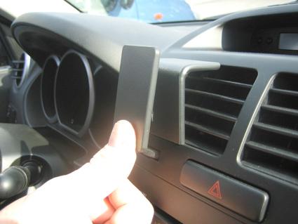 En hand håller i en svart monteringsplatta vid bilens instrumentbräda.