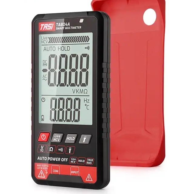 TASI TA804A är en smart multimeter som gör jobbet enklare genom att känna av vad du mäter och växla automatiskt mellan AC, DC, resistans och frekvens. Det gör att du kan fokusera på arbetet utan att vrida på några rattar. Den stora skärmen på 3,5 tum visar både digitala värden och en snabb analog stapel som ger en tydlig känsla för förändringar i signalen. Ett avtagbart skyddsskal och en stark LED-spotlight gör den praktisk att använda på trånga eller mörka ställen.