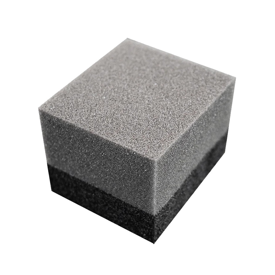 En fyrkantig, mörkgrå applikator med skumstruktur.
