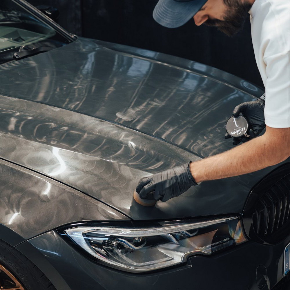 - Applicera ett tunt lager med valfri applikator (ca 5-10 ml för en normalstor bil). Det går fint applicera hela bilen i en stöt.