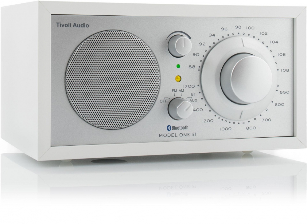 En träktboxad radio med silverfärgad front och stora rattar för volym och station.