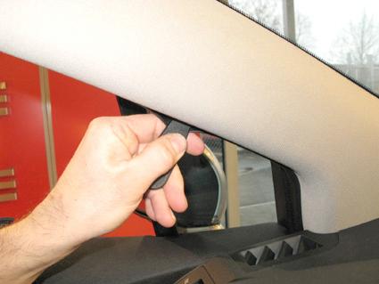 En hand greppar en plastdetalj för att ta bort inre panelen i en bil.