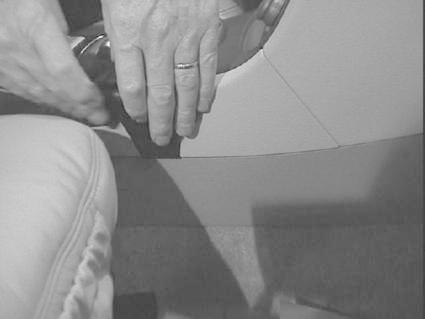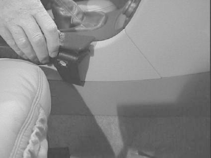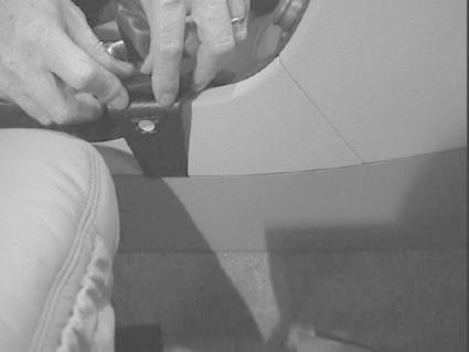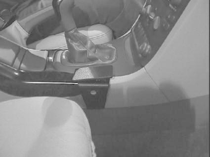 Händer som justerar eller installerar en konsol i en Volvo S80.