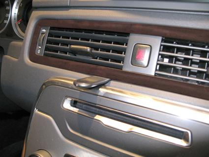 En hand justerar en träpanel nära luftventilen i en Volvo V70.