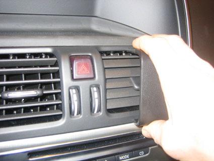 En hand justerar luftventilen i en Volvo XC60, med kontroller synliga.