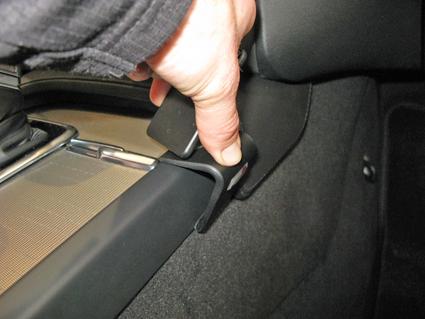 En hand håller en fyrkantig enhet över en konsol i en Volvo XC90.