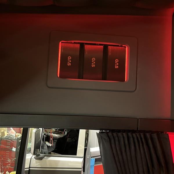 Vänster bild ovan illustrerar tydligt hur basinstallation kan se ut i lastbil. Ett bra bastillskott med minimal plats förbrukad gör den längsta av resor fullt överkomlig. I den högra bilden ser vi ett förvaringsskåp i Scania med gasdämpade till luckorna, snyggt flockad insida och micro-paket som kan kopplas in på Scania orginalknapp. I detta fall är skåpet utrustat med automatisk belysning inuti facken och en distinkt, röd belysning kastas nedåt på bakväggen.
